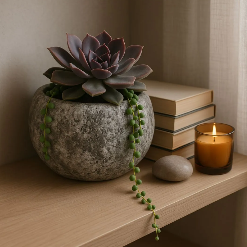 – Combine com vasos de cerâmica ou fibra de coco para um efeito mais natural;